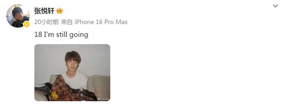 张悦轩在社交平台上传了一张照片,配文写着“18 I'm still going”,画面中他染了一头时髦的发色,穿着简单的白T恤,笑容里透出满满的自信。